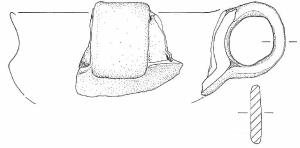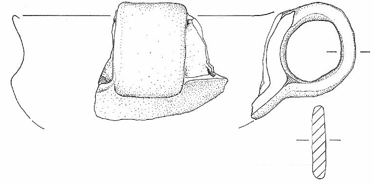 Orlo esoverso, conservato solo per il breve tratto fuso con l'innesto superiore dell'ansa, corpo a profilo articolato, con collo nettamente concavo, carena a spigolo vivo a circa metà dell'altezza e base a calotta. \nReca un'ansa con sezione a nastro e profilo ad anello, impostata fra carena e orlo, leggermente sopraelevata sull'orlo. Colore: bruno-grigio.