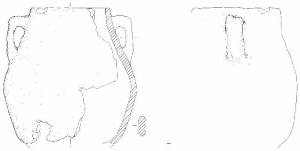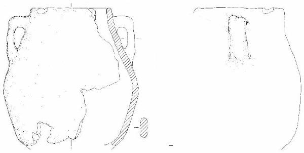 Orlo piatto, corpo a profilo biconico con spalla arrotondata, collo con profilo troncoconico e andamento leggermente concavo, ventre troncoconico con andamento rettilineo, decisamente rientrante in prossimità della base piana non conservata. \nSi conserva un'ansa con sezione a nastro e profilo a gomito con massiccio ponticello superiore orizzontale, posta sul collo poco sotto l'orlo e sopra il punto di max espansione \nColore: da marrone a tratti aranciato a bruno.
