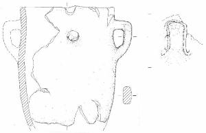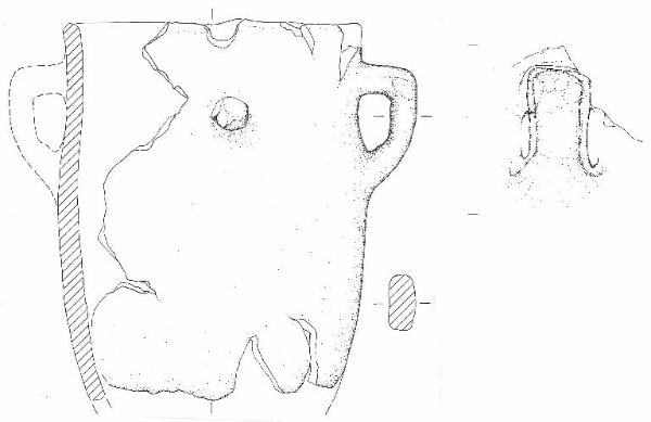 Orlo arrotondato, profondo corpo a profilo cilindrico con parete ad andamento concavo-convesso appena accennato, base piana non conservata. \nSi conserva un'ansa,, a sezione a spesso nastro e profilo a gomito con ponticello superiore orizzontale, posta sulla parete sotto l'orlo a circa ¿ dell'altezza. \nSulla parete, a circa 90 gradi di distanza dall'ansa, si conserva un bottone-bugnetta decorativo applicato, poco rilevato, di forma approssimativamente cilindrica. \nColore: grigio.
