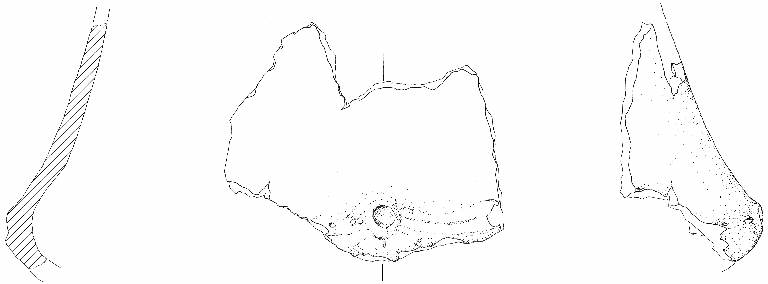 Orlo non conservato, corpo complessivamente biconico, base non conservata.\nLa spalla presenta una bozza cava con profilo mammelliforme, decorata con una leggera depressione circolare da cui si dipartono nei due sensi due cordoni risparmiati a leggero rilievo sulla superficie da due leggere solcature con andamento orizzontale leggermente arcuato, poste a festone ad assecondare la morfologia della bozza . Colore: grigio scuro.