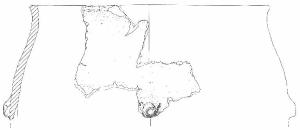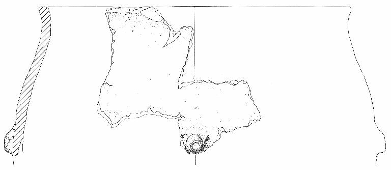 Orlo liscio piatto esoverso, leggermente ingrossato in sezione, grande corpo complessivamente globoso o biconico-globoso, ventre sotto la max espansione e base piana non conservati. \nPresso la max espansione o poco sopra si conserva una decorazione a bugnetta plastica applicata troncoconica. Colore: bruno.