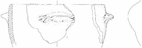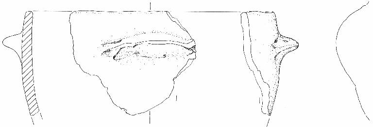 Orlo piatto liscio, corpo a profilo complessivamente troncoconico con andamento della parete leggermente convesso, base piana non conservata.\nReca sulla parete poco sotto l'orlo una presa a linguetta orizzontale di forma lunata. Colore: da beige a nero.