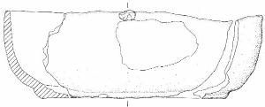 Orlo verticale piatto liscio, leggermente assottigliato in sezione, di fattura piuttosto irregolare, corpo a profilo complessivamente troncoconico con andamento della parete decisamente convesso, base piana ben distinta dalla vasca dalla netta discontinuità del profilo. \nSulla parete tangente all'orlo, non in posizione sopraelevata, si conserva una decorazione costituita da una minuscola bugnetta conica applicata. Colore: da grigio a grigio-bruno a bruno-nero con aloni aranciati per focature.