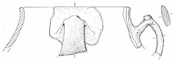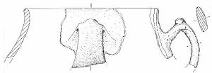Orlo piatto su labbro leggermente esoverso, collo con andamento della parete leggermente concavo, che restituisce un profilo complessivamente biconico, con punto di max espansione e base piana non conservati.\nSul collo si conserva una buona porzione di un'ansa con sezione a largo e stretto nastro e profilo a gomito con ponticello superiore innenstato obliquamente in parete, posta tra il collo e probabilmente la max espansione del recipiente; sull'apice della piega a gomito reca una decorazione a bottoncino cilindrico applicato, ben sagomato. Colore: bruno-nero uniforme.