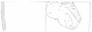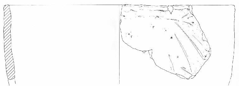 Orlo piatto, corpo a profilo complessivamente troncoconico con andamento della parete assai leggermente convesso, base piana non conservata. Colore: da beige a bruno-nero, con evidente esposizione al fuoco.