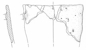 Orlo con rifinitura piuttosto irregolare arrotondato, solo a tratti piatto, il tratto della parete conservato restituisce un profilo complessivamente troncoconico con andamento della parete rettilineo, base piana non conservata.\nSi conserva poco sotto l'orlo il possibile accenno della radice superiore destra di un'ansa. \nColore: bruno-nero, a tratti grigio.