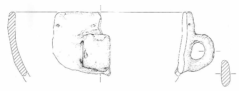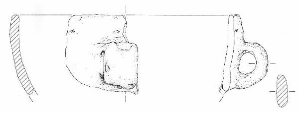 Orlo non distinto verticale piatto, corpo fr. a profilo complessivamente troncoconico con andamento parete convesso, base piana non conservata.\nSi conserva sulla parete sotto l'orlo un'ansa con sezione a nastro largo e stretto e profilo ad anello. Colore: bruno.