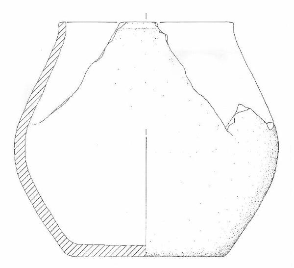 Orlo piatto liscio leggermente ispessito in sezione, su labbro verticale, corpo a profilo biconico con max espansione a metà dell'altezza, spalla ampia e arrotondata, base piana. Non si conservano traccia di anse o di altri elementi di presa. Colore: bruno.