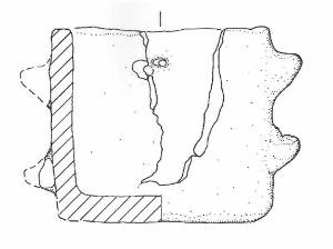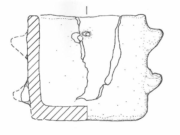 Orlo piatto liscio, corpo a profilo cilindrico con parete rettilinea, base piana. \nReca, in posizione opposta sulla parete, due gruppi costituiti da due decorazioni/prese a bugnetta troncoconica ad apice arrotondato e solo leggermente rivolto verso l'alto, poste tra orlo e base a breve distanza l'una dall'altra in successione verticale. A circa 90 gradi di distanza dalle presette e fra loro opposti, si conservano due fori passanti di forma piuttosto irregolare, posti sotto l'orlo all'altezza della bugnetta superiore, ricavati con ogni probabilità perforando a secco la parete dura del recipiente in un momento successivo alla cottura. \nColore: da beige a bruno.