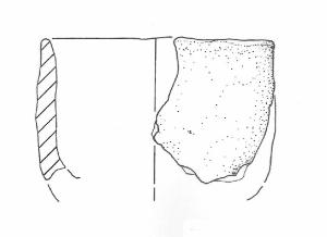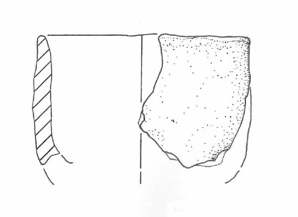 Orlo arrotondato leggermente assottigliato in sezione su labbro verticale, il tratto di parete conserva restituisce un profilo complessivamente cilindrico-troncoconico con andamento della parete leggermente convesso verso la base, base non conservata. Colore: bruno-nero.