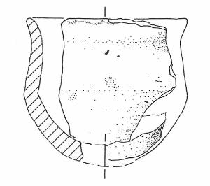 Orlo esoverso leggermente assottigliato in sezione, parete sopra la max espansione a profilo concavo, carenatura posta poco sotto la metà dell'altezza, base a calotta. \nNon si conserva traccia dell'ansa. Colore: grigio scuro.