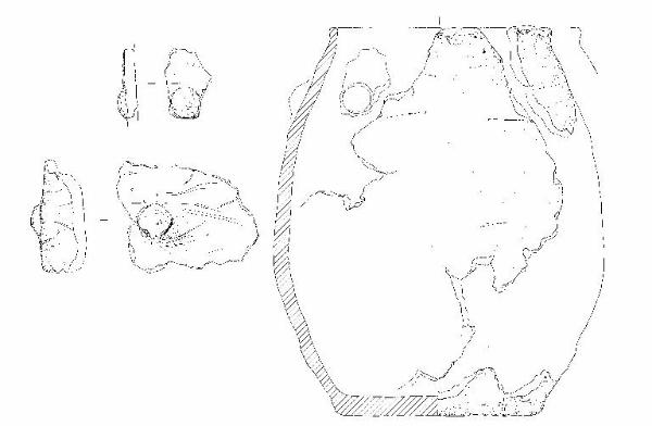 Orlo arrotondato su labbro verticale non distinto solo a tratti leggermente esoverso, di fattura molto irregolare, corpo a profilo ovoide con parete decisamente convessa e max espansione a circa metà dell'altezza, base piana su leggero tacco. \nDue frr. di parete sicuramente pertinenti al vaso ma non reintegrabili recano due pasticche applicate cilindriche poco rilevate, probabilmente pertinenti al collo del vaso, a circa ¿ dell'altezza. Colore: bruno-nero con focatura chiara.