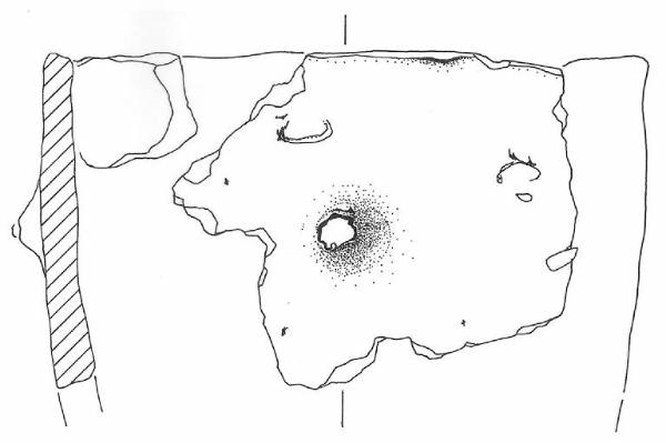 Orlo piatto con andamento piuttosto irregolare, il tratto del corpo conservato restituisce un profilo troncoconico con andamento della parete appena convesso, base piana non conservata.\nReca applicata poco sotto l'orlo una bugnetta conica ad apice arrotondato. \nColore: da grigio a bruno-nero.