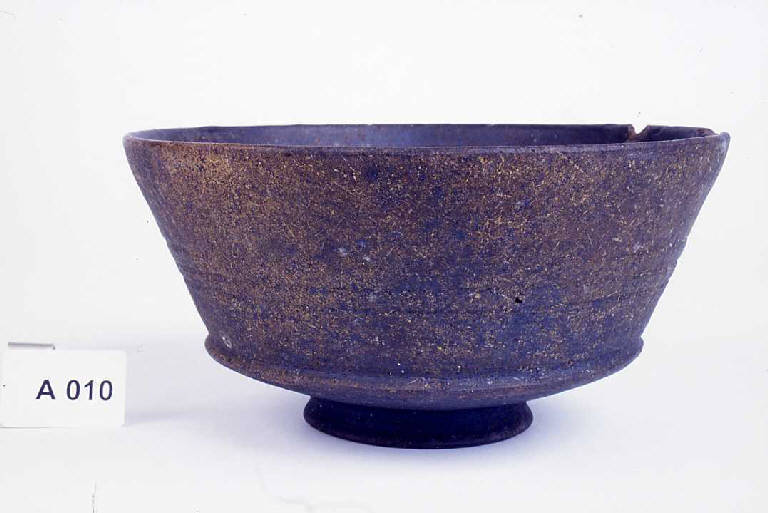 Basso piede svasato, vasca con carenatura accentuata e parete svasata verso l'alto con linee incise.