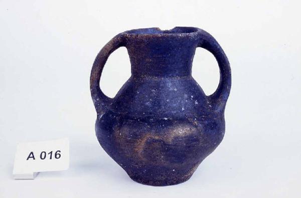 Corpo apodo con parte inferiore carenata, spalla spiovente, collo cilindrico, anse impostate fra l'orlo e il punto di carenatura.