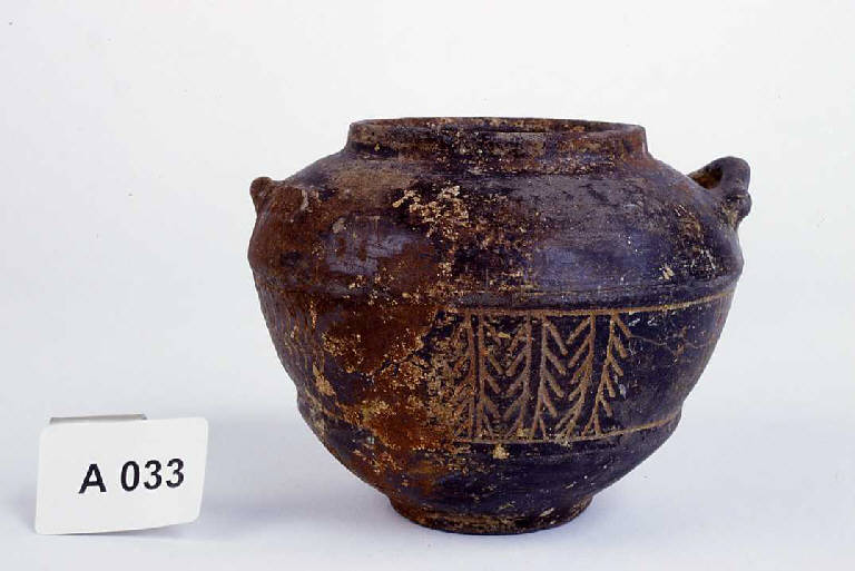 Piede a disco, corpo ovoide con spalla rigonfia, orlo verticale, anse a bastoncello con appendici laterali. Decorazione incisa a rametti contrapposti e tremoli verticali sul corpo.