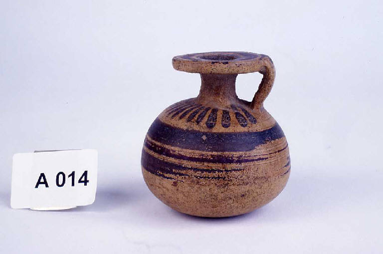 Corpo globulare con orlo piatto e ansa a nastro. Decorazione a linguette al margine inferiore del collo e fasce sul corpo.