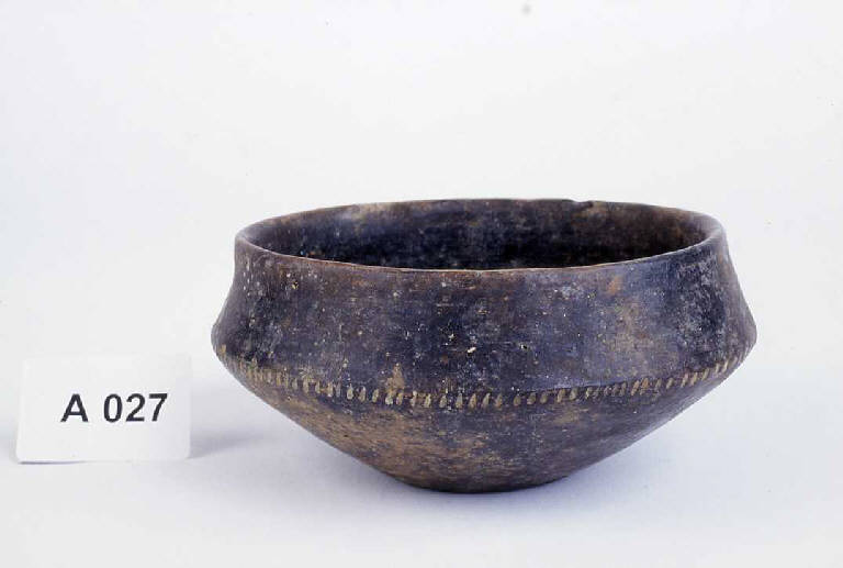Vasca carenata apoda ad orlo rientrante. Decorazione a trattini impressa sul punto di carenatura.
