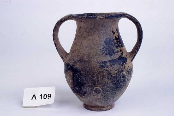 Piede a disco, corpo ovoidale, alto collo troncoconico con orlo estroflesso e anse a nastro (RASMUSSEN T. 1d). Decorazione a incisioni verticali sul corpo.
