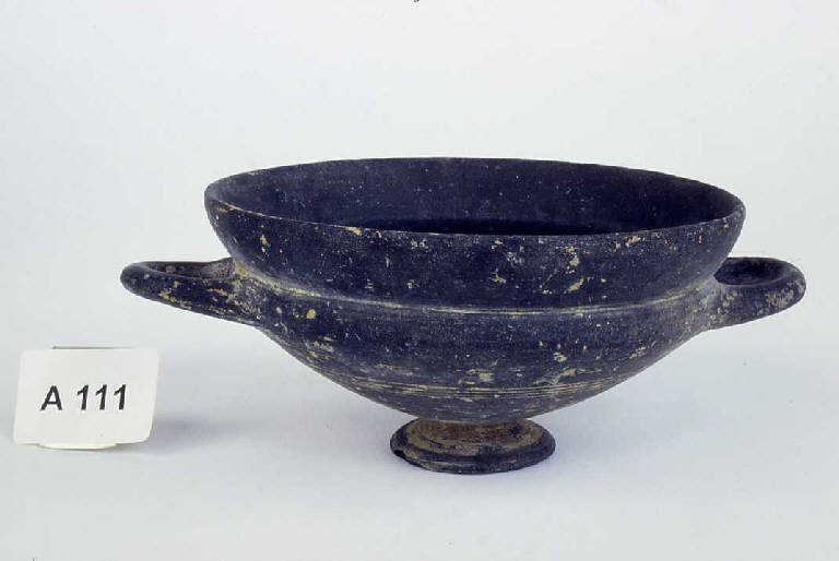 Piede a tromba, vasca a pareti curve con orlo svasato e rigonfio, anse a bastoncello impostate sotto l'orlo (RASMUSSEN T.3 b). Decorazione con gruppo di 4 linee incise sul corpo.