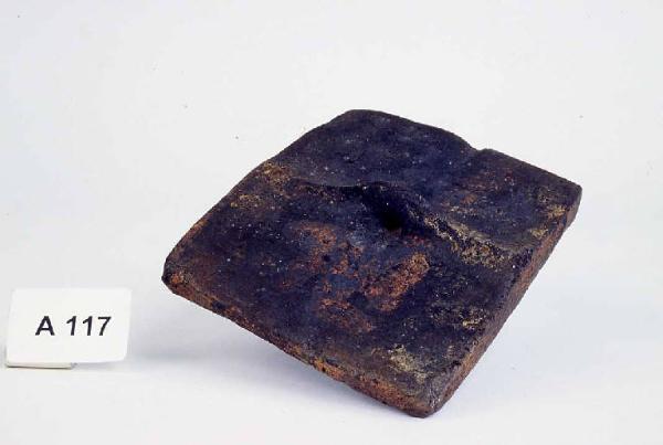 Chiusino rettangolare di urna a capanna con presa centrale forata per inserzione bastoncello.