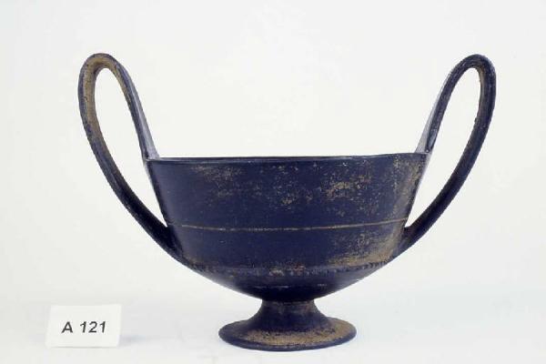 Piede a campana. vasca carenata con orlo svasato a anse a nastro ingrossato (RASMUSSEN T. 3 e). Decorazione impressa sulla carenatura.