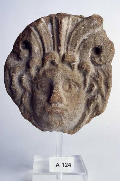 Antefissa con contorno inferiore ovale, senza zoccolo, con palmetta a 5 lobi e volto di gorgone rozza.