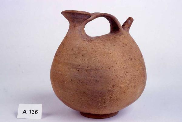 Piede ad anello, corpo rigonfio con bocchello svasato e versatoio conico, ansa a nastro impostata orizzontalmente nella parte superiore del corpo.