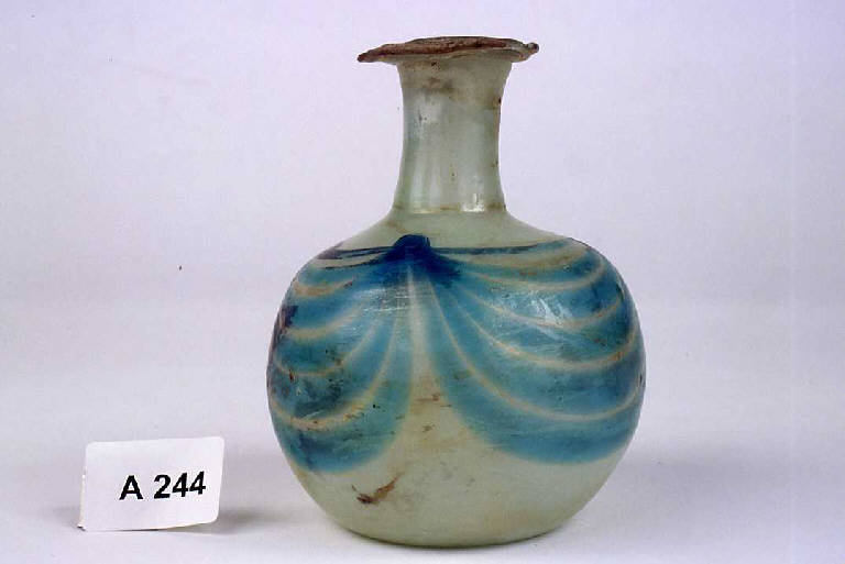 Fondo piatto, corpo globulare con alto collo e orlo piatto. Decorazione a festoni blu sul corpo.
