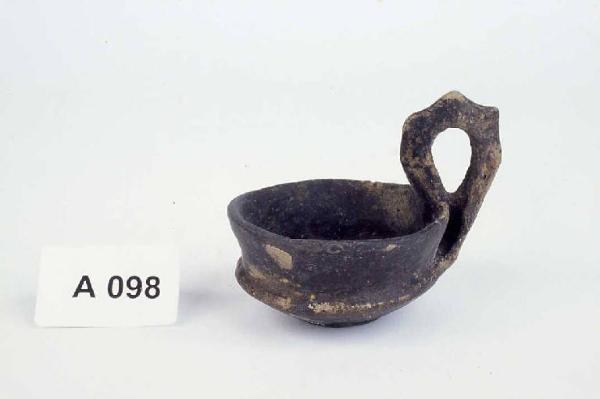 Corpo apodo carenato con orlo poco svasato e ansa crestata sormontante.