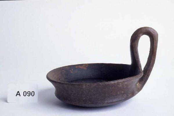 Corpo apodo carenato con orlo poco svasato e ansa a nastro ingrossato sormontante.