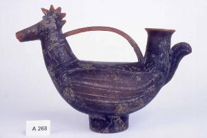 Piede ad anello, corpo rigonfio allungato con versatoio a testa di gallo crestata e imboccatura cilindroide, ansa a nastro impostata orizzontalmente nella parte superiore del corpo. Decorazione impressa a pettine sul corpo.