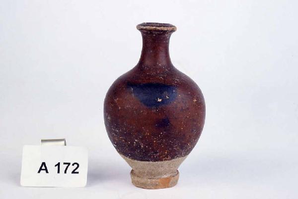 Piede ad anello, corpo ovoidale a spalla poco segnata, alto collo con breve orlo obliquo. Verniciati i 2/3 superiori del corpo.