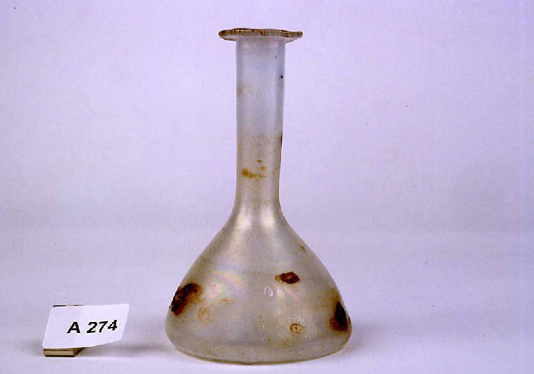 Corpo conico inferiormente, alto collo con orlo piatto.