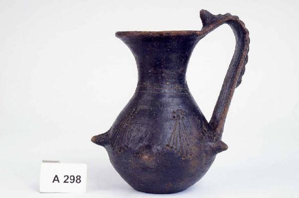 Corpo piriforme apodo con orlo svasato, ansa a nastro con applicazione a cordoncino plastico centrale. Decorazione incisa a rosette con lineette sul corpo e bugne coniche all'attacco ansa e nel punto di max espansione.
