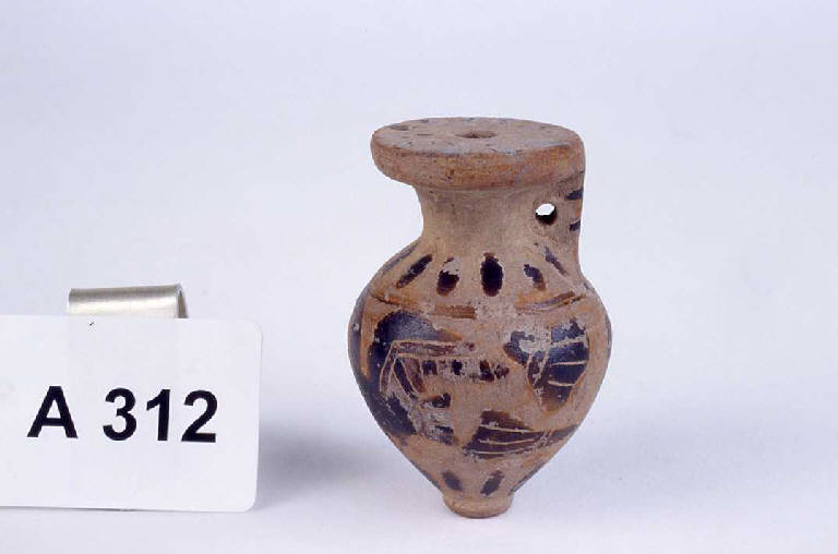 Corpo ovoidale con pieduccio, orlo piatto e ansa a nastro. Decorazione figurata con volatile dipinto e inciso sul corpo.