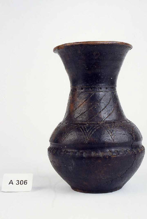 Corpo apodo globulare con solcatura centrale, alto collo biconico ad orlo lievemente aggettante. Decorazione impressa e incisa sul corpo a file puntinate, tratti obliqui e triangoli.