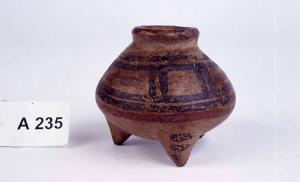 Corpo globulare depresso con tre piedini conici. Decorazione a tratti e riquadri bicromi.