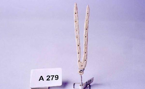 Spillone doppio decorato con cerchietti forati uniti da tratti obliqui.