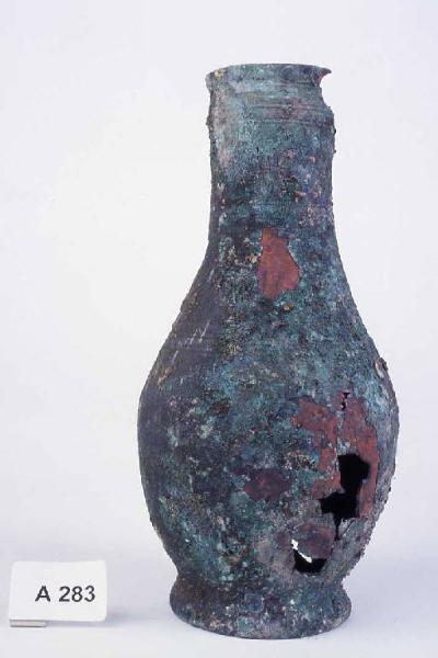 Piede svasato, corpo ovoidale con alto collo ad orlo indistinto. Decorazione con tre fasce incise sul corpo.