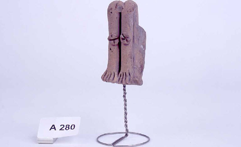 Parte inferiore di statuetta con arti uniti e ripiegati decorati da un elemanto floreale.