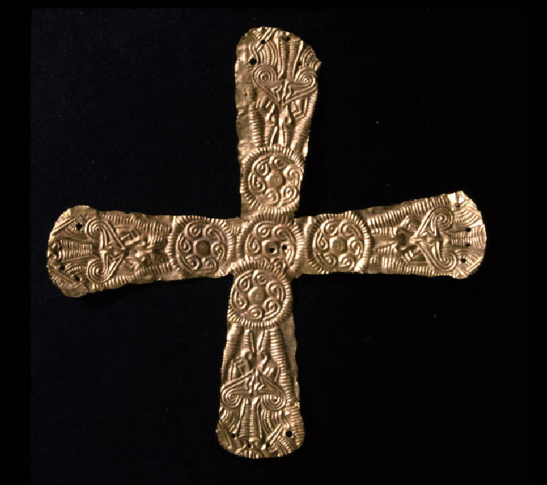 - NOTIZIE STORICO CRITICHE Il corredo appartiene a una delle tre tombe longobarde, la n. 3, rinvenute nel 1963 in località San Lorenzo, presso Offanengo. Benchè siano state, fin dall'inizio, messe in relazione con la scomparsa chiesa di San Lorenzo, la cascina omonima che sorge sull'area della chiesa e il sito della necropoli sono separati da una strada che ricalca il tracciato di età romana. Questa circostanza induce a pensare che le tombe non appartenessero alla chiesa di San Lorenzo, ma piuttosto a quella di San Michele, un tempo situata nelle vicinanze e anch'essa andata distrutta.\nLa presenza nel corredo di una crocetta in lamina d'oro e di borchie dorate decorate a punzone dimostra che il defunto era un guerriero di rango elevato. La zanna di cinghiale può essere collegata a un significato magico dell'animale, ma anche al prestigio acquistato dal defunto come guerriero e cacciatore. \nPer quanto riguarda la datazione, la tipologia dell'umbone rimanda cronologicamente al sec. VII. Confronti con le tombe T e 9 di Castel Trosino portano la datazione alla seconda metà dello stesso secolo. Riscontri tra le placche di una cintura di ferro, forse dalla tomba n.2, e analoghe placche ritrovate in Germania meridionale, datate con sicurezza all'ultimo terzo del sec. VII, restringono la datazione dei tre corredi a questo arco cronologico.