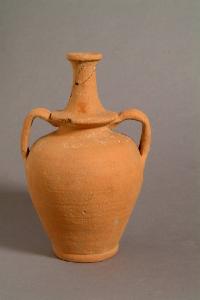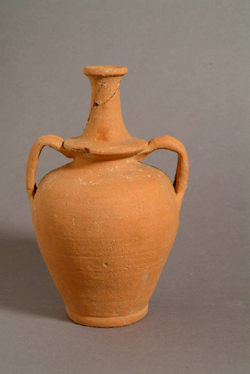 Orlo a sezione triangolare, lungo collo troncoconico su base a listello, corpo ovoidale, anse a nastro impostate sulla spalla e saldate al di sotto del listello, piede a disco accennato