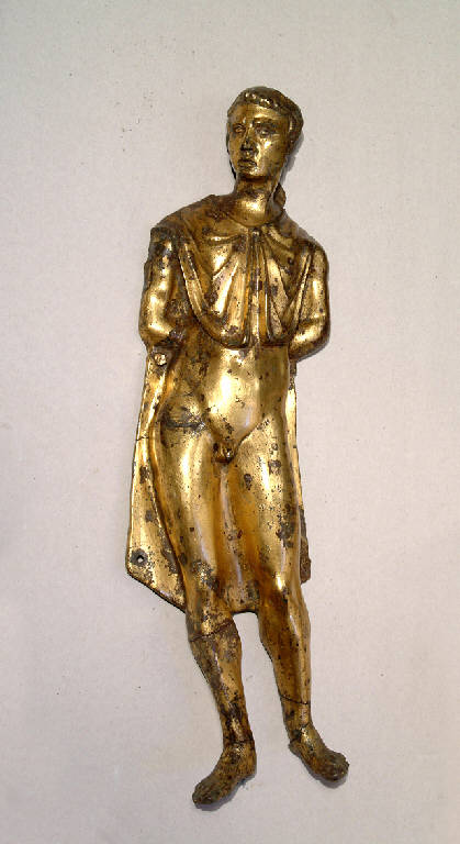 Statuetta cava dalle spalle ai malleoli, raffigurante giovane stante e nudo, ricoperto del solo mantello (lacerna) appuntato sullo sterno e ricadente dietro fino alle ginocchia, con braccia piegate dietro la schiena e la testa volta verso sinistra