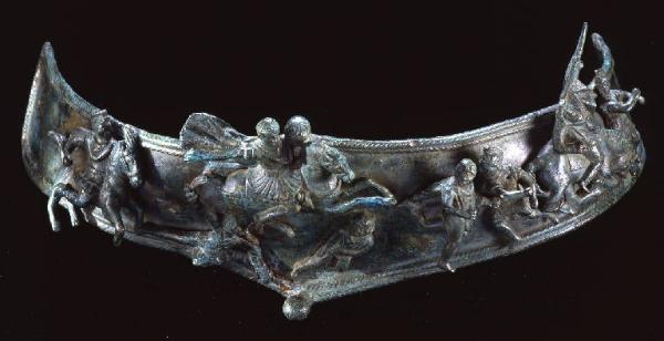 Pettorale di cavallo costituito da una robusta piastra a losanga dai margini sagomati. Al centro, diametralmente opposti, due bottoncini rilevati. E' ornata da statuette applicate con perni ribattuti: tre cavalieri e cinque fanti in atto di combattimento, disposti "a cresta d'onda", che rappresentano una scena di battaglia tra soldati romani a cavallo e barbari in fuga