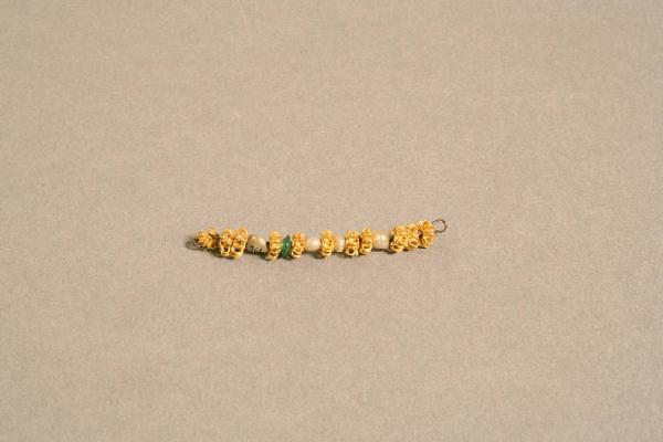 Filo d'oro nel quale sono infilate undici piccole spirali d'oro alternate a quattro perline naturali ed un vago in pasta di vetro di colore azzurro/verde