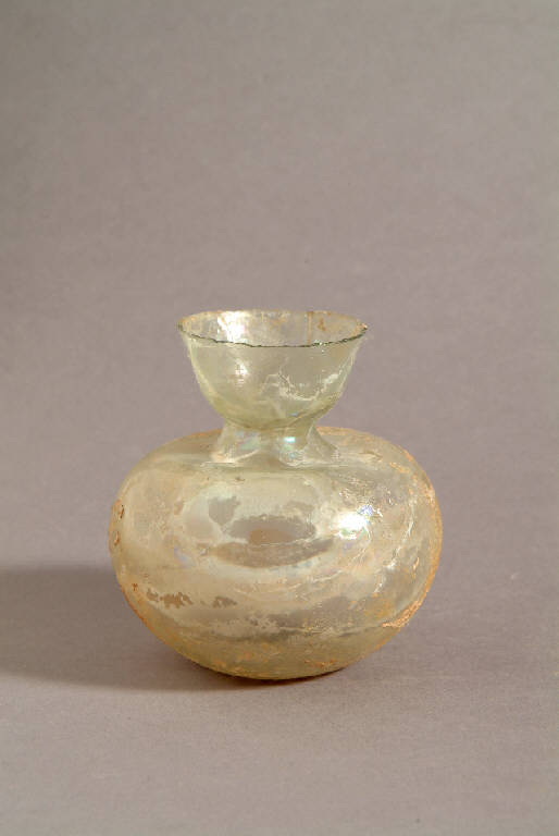 Orlo tagliato, collo a imbuto con strozzatura alla base, corpo sferico leggermente schiacciato su base piana