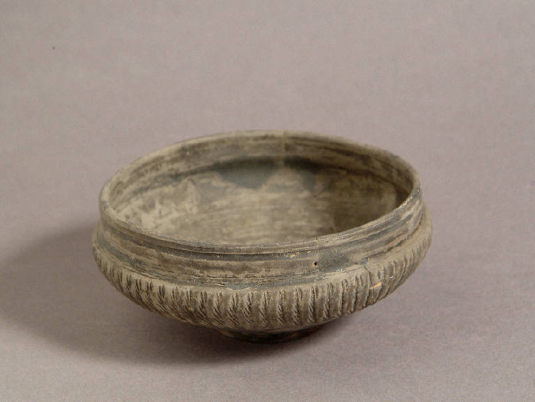 Orlo diritto sottolineato da due solcature, nettamente separato dalla vasca a profilo troncoconico rovescio; piede a disco. Decorazione a rotella