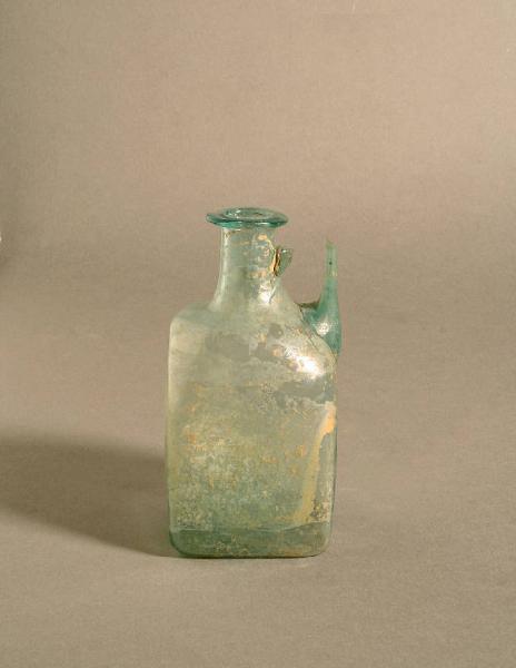 Orlo estroflesso e appianato, breve collo cilindrico, sottile ansa a nastro con estremità ingrossate, spalla con angoli smussati, corpo cubico, fondo piano senza traccia di bollo