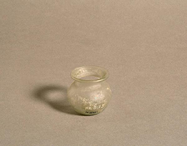 Largo collo a orlo estroflesso ed ingrossato, breve gola che si espande nel corpo tondeggiante un poco schiacciato, apodo, fondo leggermente concavo
